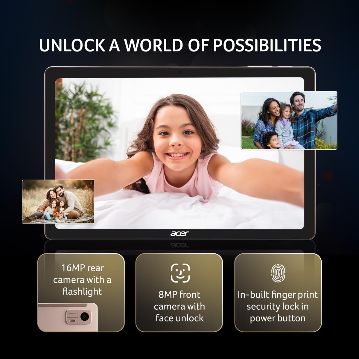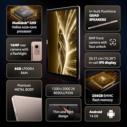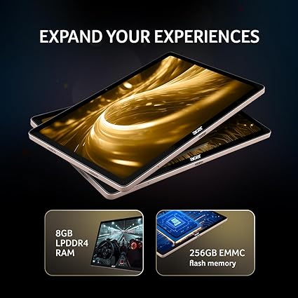- Acer Iconia Tab iM10-22 | 10.36" 2K IPS Display, Quad Speakers, 8GB RAM + 256GB Storage, 16MP Rear + 8MP Front Camera, Fingerprint Reader, Wi-Fi + 4G LTE(Calling), Android 14, Slim Metal Body, Gold
