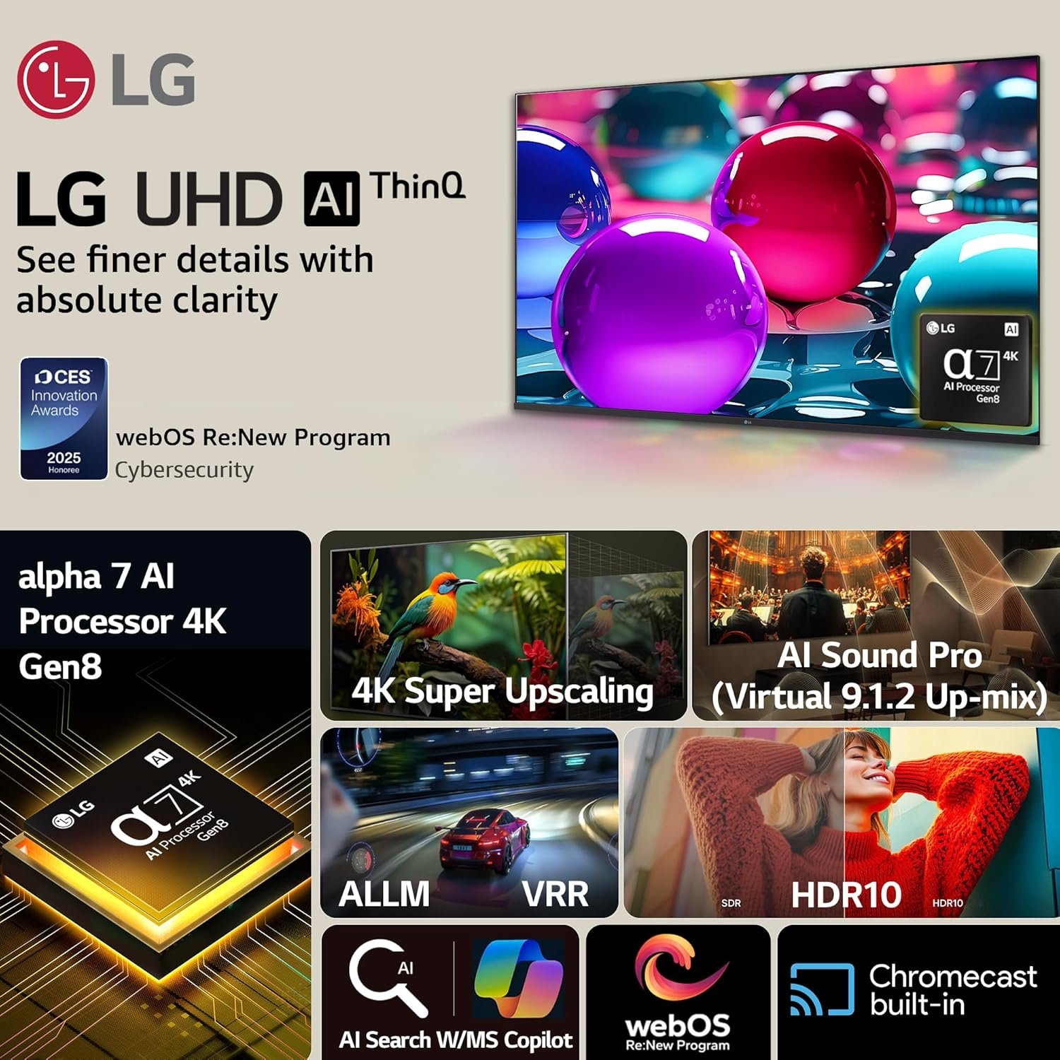 • Picture Quality Enhancement Technology4K Expression Enhancer, 4K Super Upscaling, Dynamic Tone Mapping, FILMMAKER MODE™, HDR10 / HLG
