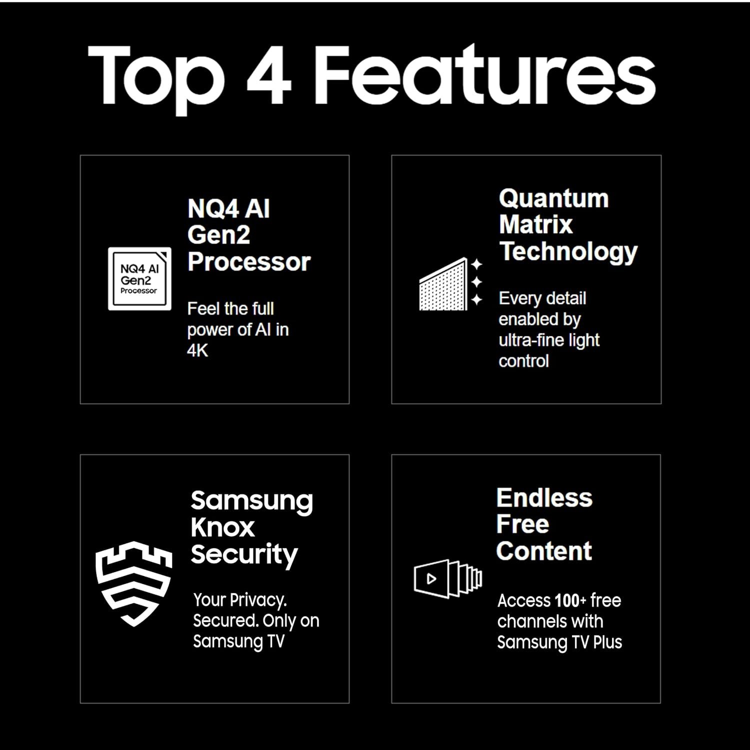 • Display Features: NQ4 AI Gen2 Processor (Feel the full power of AI in 4K) | Quantum Matrix Technology (Every detail enabled by ultra-fine light control) | HDR 10+ (Adaptive/Gaming) | Neo Quantum HDR | 4K AI Upscaling | HLG (Hybrid Log Gamma) | Wide Viewing Angle | Supreme UHD Dimming | Real Depth Enhancer | Motion Xcelerator 120Hz | Film Mode | HDMI Black Level | Adaptive Picture | HDR Brightness Optimizer