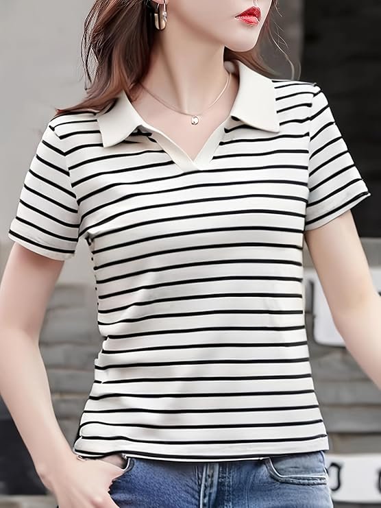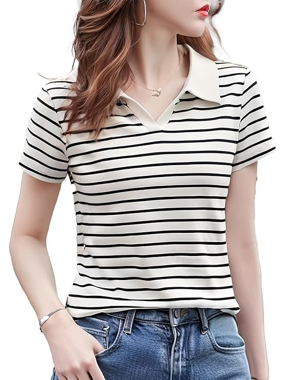 Women’s Striped Polo T-Shirt – Short Sleeve Casual Summer Top with Collar Neck