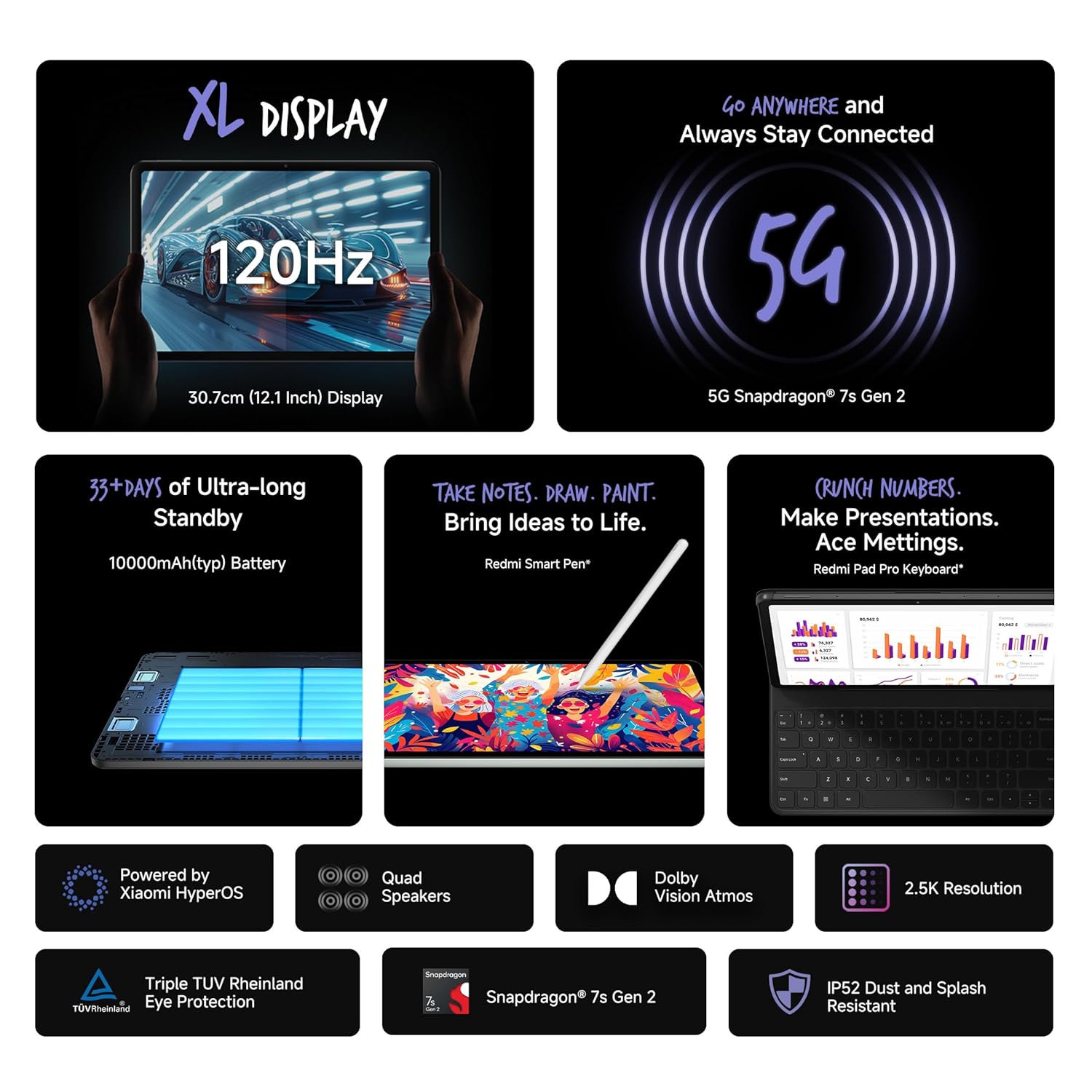 Redmi Pad Pro 5G |Snapdragon 7s Gen 2|30.7cm(12.1") Tablet|33+ Days Standby| 10000mAh|HyperOS|8GB, 128GB|Quad Speakers |Wi-Fi 6 + 5G |Graphite Grey